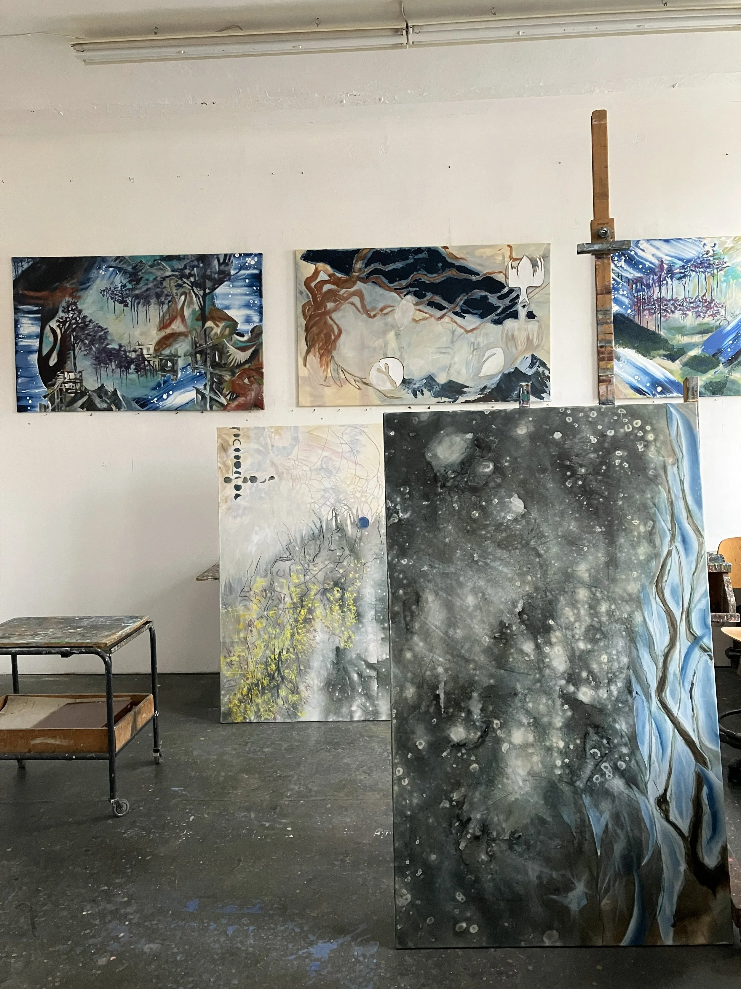 My current work unfolds along two primary directions: large-scale painting and material-based surface work with epoxy resin. While differing in approach, both investigate surface, depth and transformation.